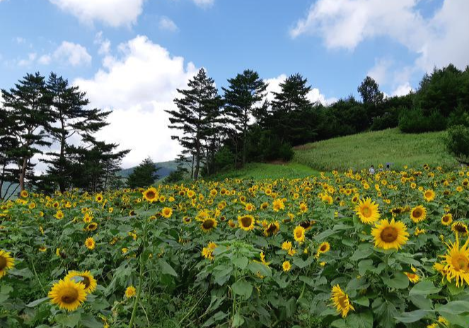 첫 번째로 소개해 드릴 곳은 구와우 마을입니다. 구와우 마을의 이름은 아홉 마리의 소가 누워있는 모습 같다고 해서 지어진 이름입니다. 구와우 마을은 원래 예전에는 고랭지 배추밭이 었는데 해바라기를 심은 뒤로는 국내 최대의 해바라기 꽃밭으로 유명해졌습니다. 국내에서 가장 해바라기가 많이 피는 곳으로 매년 100만 송이 이상의 해바라기가 핀다고 합니다.